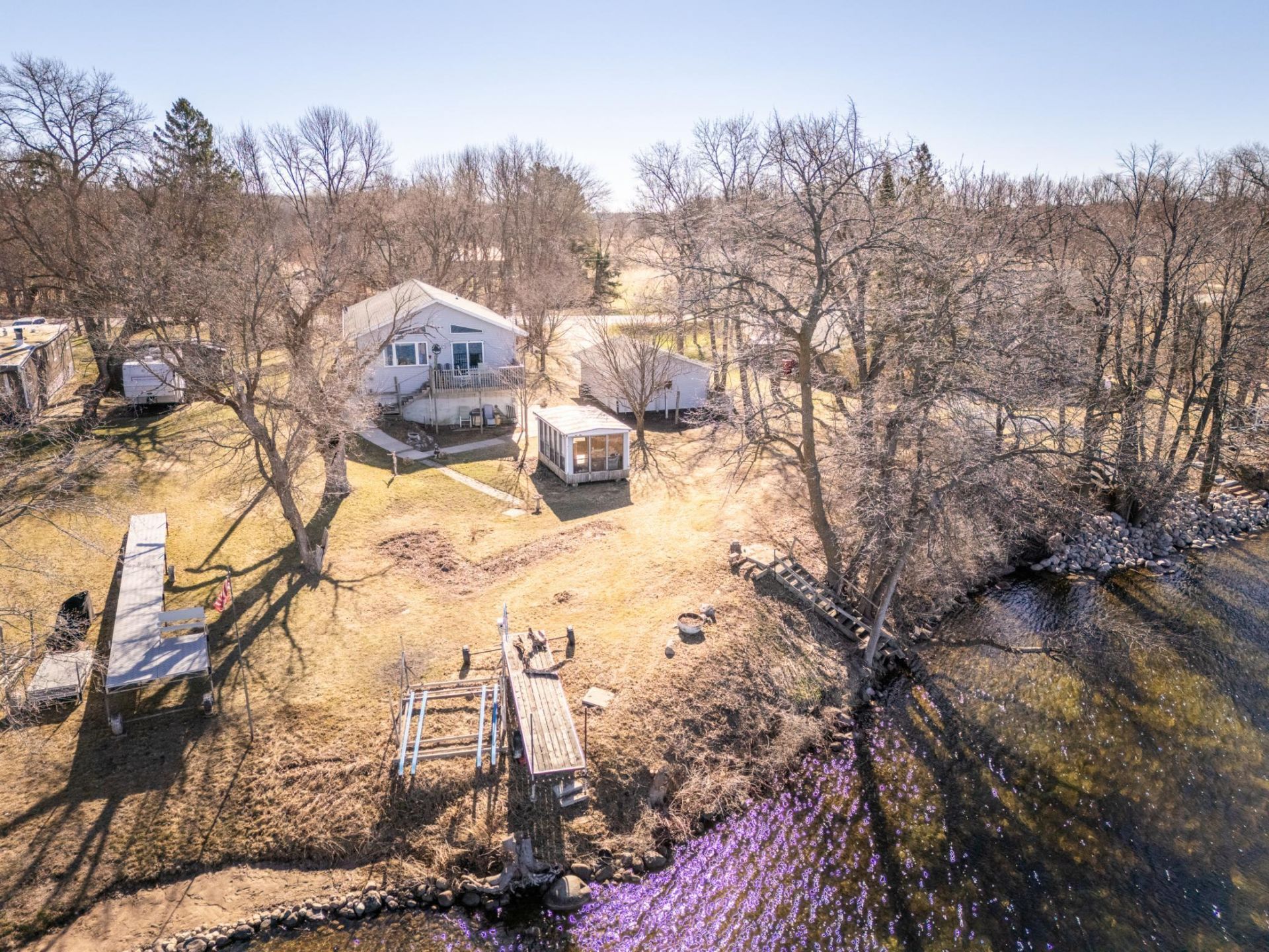 If sunsets are your groove you will want to view this year round Lake Irene home where potential abounds! The large 1-acre lot with low elevation invites you to walk down to your 118' of shoreline with sand and gravel bottom - where you can catch your limit of crappies right from the dock. The yard features mature shade trees, a neat little lakeside bunk house, and a 20x30 detached garage. Inside you'll find an upper level open floor plan with a wall of windows allowing you to take in the incredible sunset lake views from indoors, or easily step out onto the deck. There are three bedrooms, two full baths, and laundry on this level. The walkout lower level features a 26' family room that will let your imagination run wild. This level also hosts the fourth bedroom, another full bath, and an office with a window and two doors. This home with good bones sits on a beautiful lot with a gentle slope to incredible frontage on one of this area's popular fishing and recreation lakes. Lake Irene is over 600 acres, 44 feet deep, with two public boat launches. Check out the possibilities here that will make your creative side show!